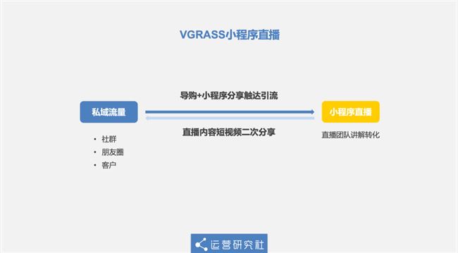 服飾品牌 VGRASS 則在今年 2 月開始嘗試小程序直播,通過(guò)導(dǎo)購(gòu)和小程序分享觸達(dá)用戶;同時(shí)導(dǎo)購(gòu)還會(huì)在社群里,把直播間內(nèi)容剪成短視頻,二次觸達(dá)社群和朋友圈里的用戶。半年來(lái),VGRASS 小程序銷售破 9000 萬(wàn),其中直播業(yè)績(jī)占比 36%。