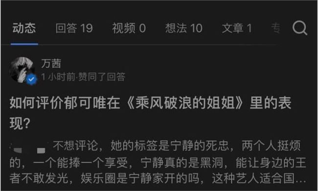 9 月 6 日凌晨,有網(wǎng)友發(fā)現(xiàn)萬茜在知乎上點贊寧靜和郁可唯的惡評,隨后引發(fā)熱議。事件發(fā)酵后,萬茜在幾小時后取消了點贊。