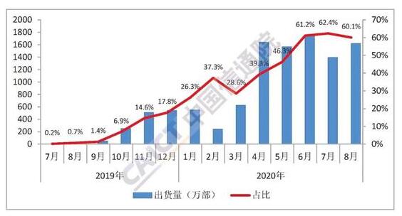 5G手機(jī)方面,2020 年 8 月,國(guó)內(nèi)市場(chǎng) 5G 手機(jī)出貨量 1617.0 萬(wàn)部,占同期手機(jī)出貨量的 60.1%;上市新機(jī)型 22 款,占同期手機(jī)上市新機(jī)型數(shù)量的 48.9%。1-8 月,國(guó)內(nèi)市場(chǎng) 5G 手機(jī)累計(jì)出貨量 9367.9 萬(wàn)部、上市新機(jī)型累計(jì) 141 款,占比分別為 46.3% 和 46.8%。