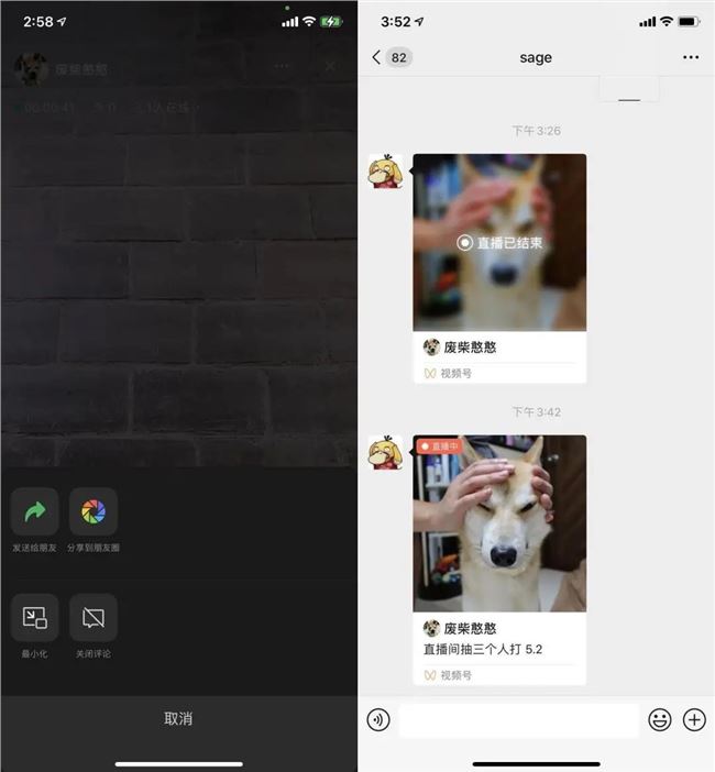 通過(guò)右上角的「...」,用戶可以將直播分享至好友或朋友圈,也可以關(guān)閉評(píng)論或?qū)χ辈ゴ翱谶M(jìn)行最小化等操作。最小化的直播窗口和視頻聊天窗口最小化的效果一致,用戶可以拖動(dòng)窗口改變其位置,再次點(diǎn)擊即可重新回到直播界面。