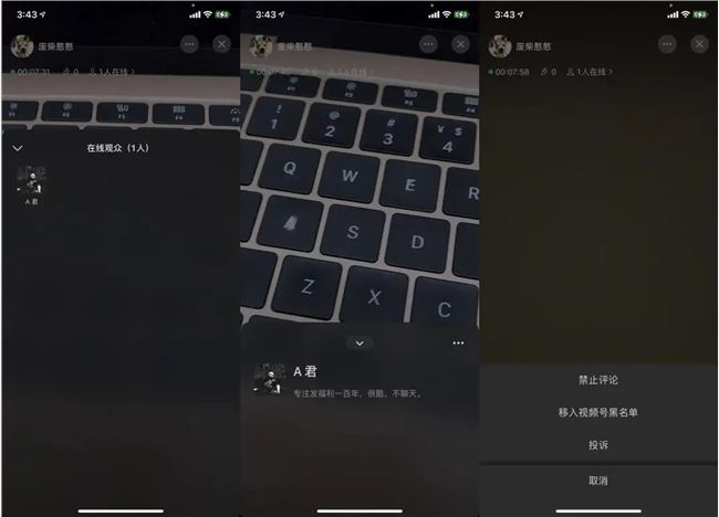 在主播端,主播點(diǎn)擊在線觀眾后可以看到觀眾的 ID 和頭像,主播也可以對(duì)用戶進(jìn)行禁止評(píng)論,移入視頻號(hào)黑名單或投訴等操作。